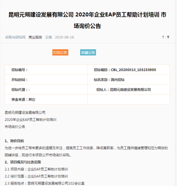 昆明元朔建设发展有限公司2020年企业EAP员工帮助计划培训市场询价公告