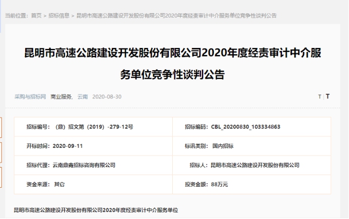昆明市高速公路建设开发股份有限公司2020年度经责审计中介服务单位竞争性谈判公告
