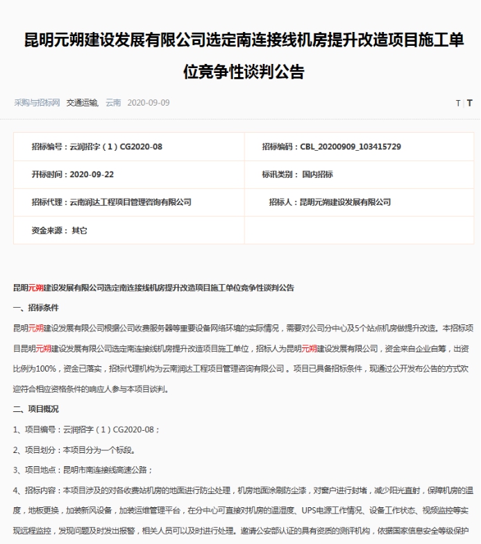 昆明元朔建设发展有限公司选定南连接线机房提升改造项目施工单位竞争性谈判公告