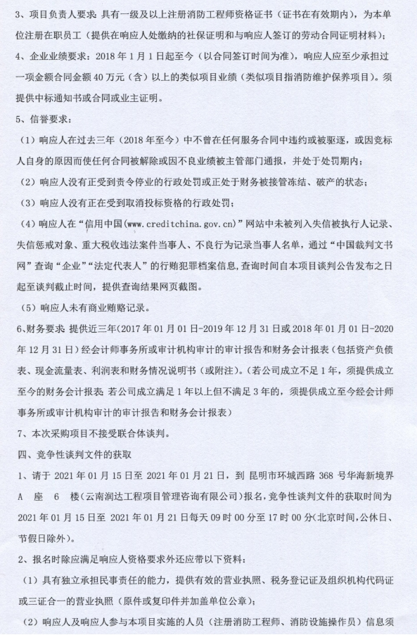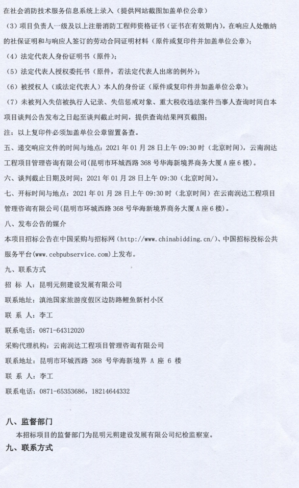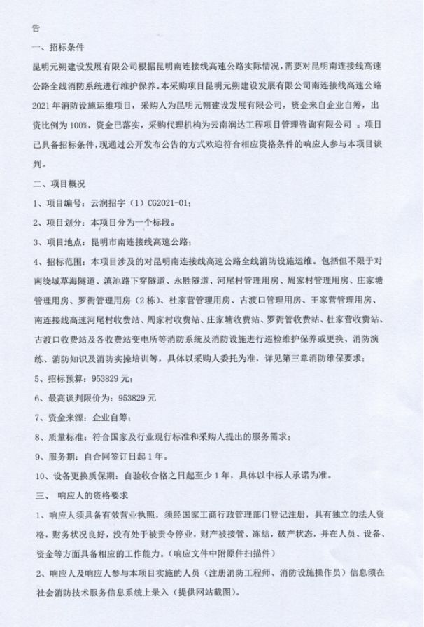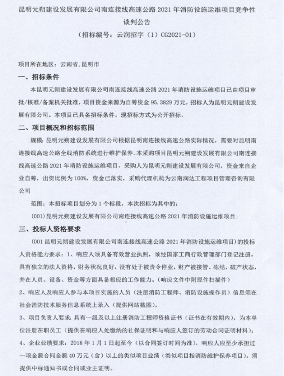 昆明元朔建设发展有限公司南连接线高速公路2021年消防设施运维项目竞争性谈判公告
