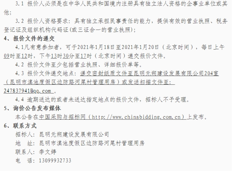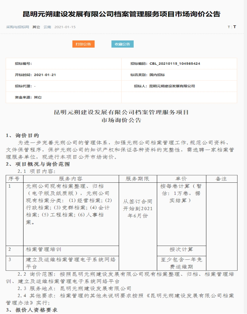 昆明元朔建设发展有限公司档案管理服务项目市场询价公告
