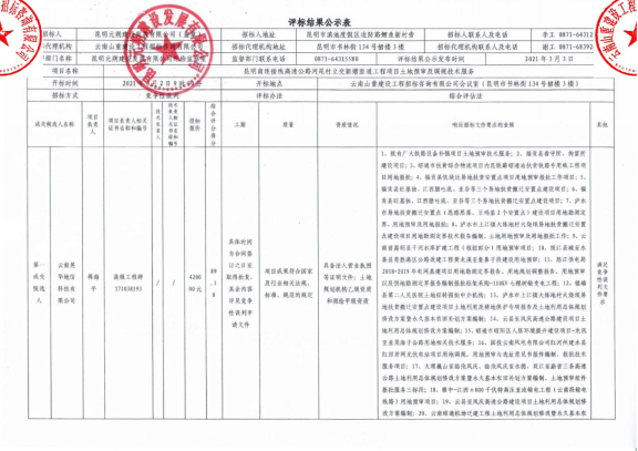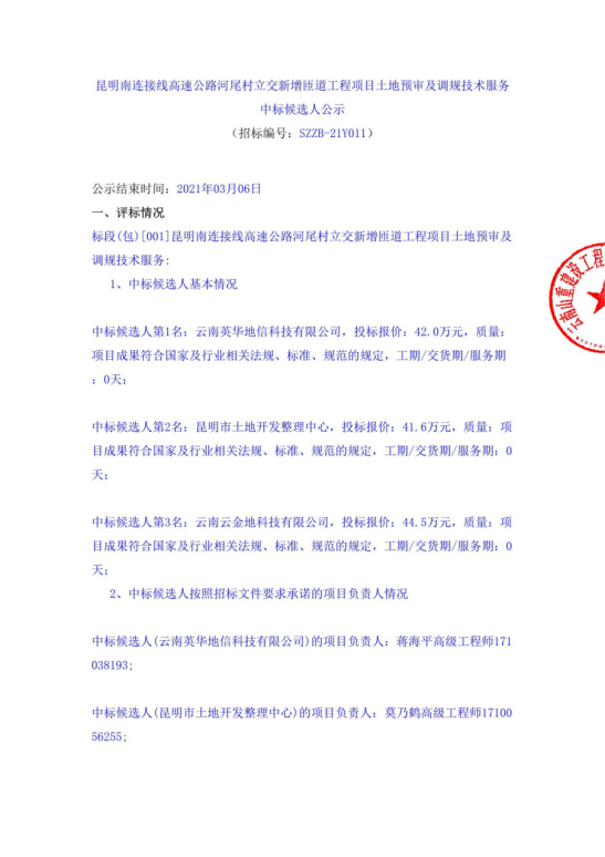 昆明南连接线高速公路河尾村立交新增匝道工程项目土地预审及调规技术服务评标结果公示
