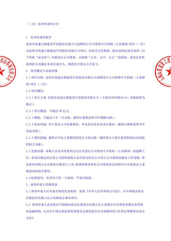 昆明市高速公路建设开发股份有限公司选聘发行公司债券中介机构(主承销商)项目(二次)竞争性谈判公告