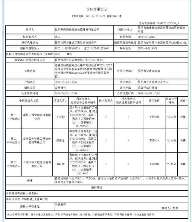选聘昆明绕城高速公路东南段运营期2021-2022年度造价咨询服务单位评标结果公示