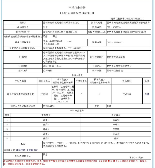 选聘昆明绕城高速公路东南段运营期2021-2022年度造价咨询服务单位中标结果公告