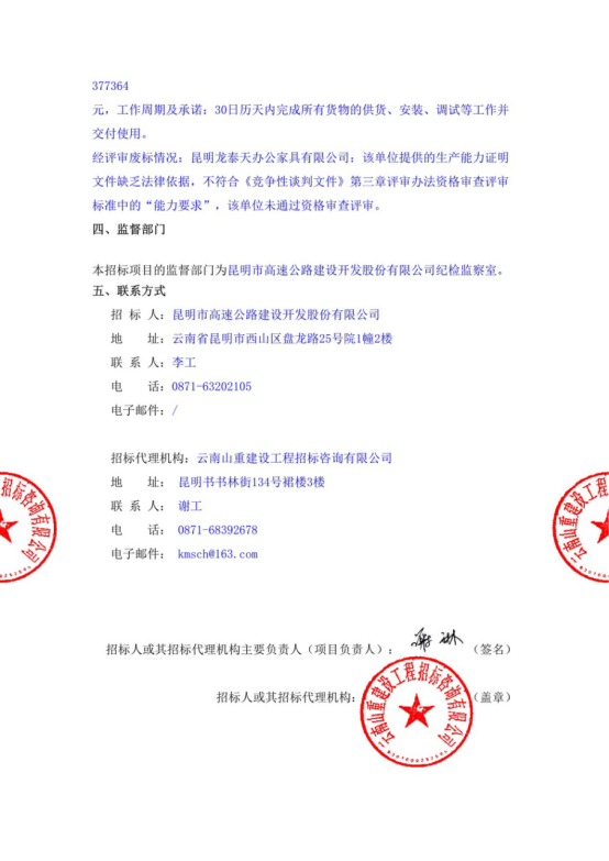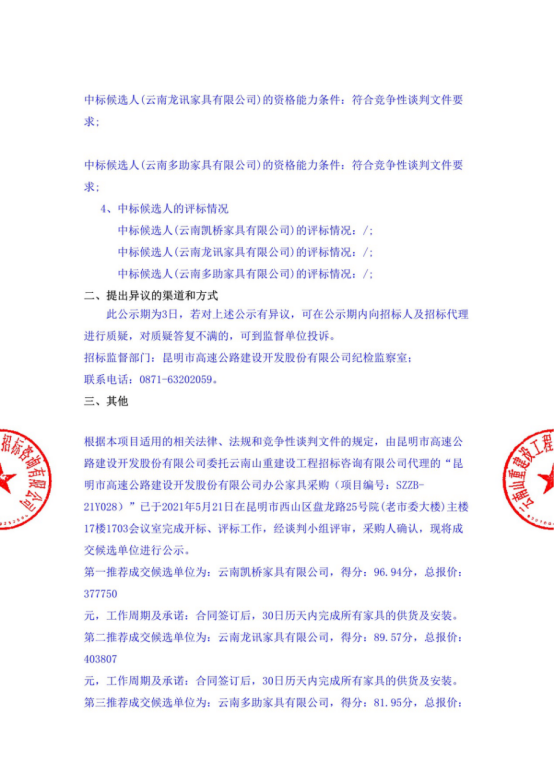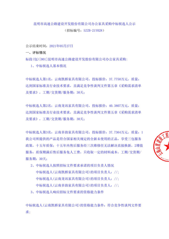 昆明市高速公路建设开发股份有限公司办公家具采购中标候选人公示