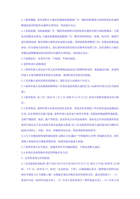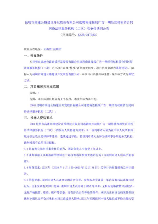 昆明市高速公路建设开发股份有限公司选聘南连接线广告一期经营权租赁合同纠纷法律服务机构(二次)竞争性谈判公告