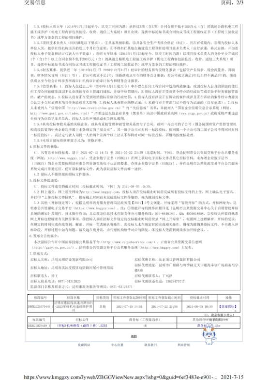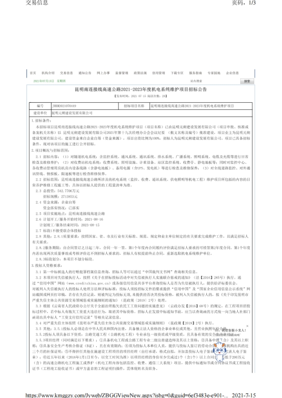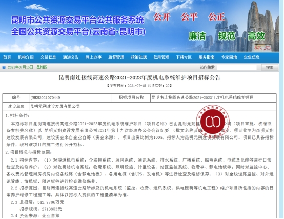昆明南连接线高速公路2021-2023年度机电系统维护项目招标公告