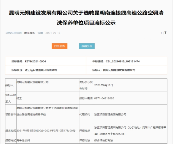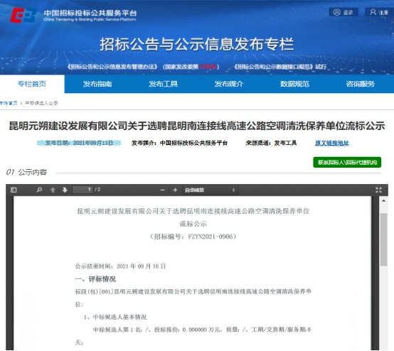 昆明元朔建设发展有限公司关于选聘昆明南连接线高速公路空调清洗保养单位流标公示