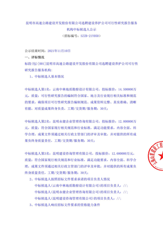 昆明市高速公路建设开发股份有限公司选聘建设养护公司可行性研究报告服务机构中标候选人公示