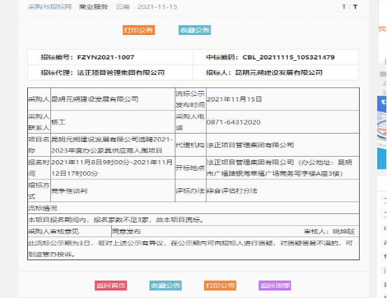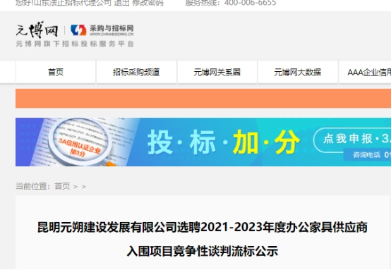 昆明元朔建设发展有限公司选聘2021-2023年度办公家具供应商入围项目竞争性谈判流标公示