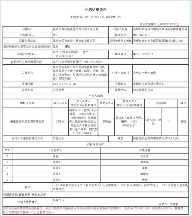 昆明绕城高速公路东南段运营期2021-2023年日常养护工程(路基、路面、桥涵、隧道、道路保洁、沿线绿化及交通安全设施维修)第1标段中标结果公告