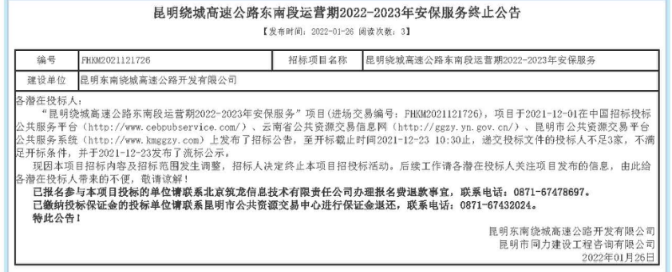昆明绕城高速公路东南段运营期2022-2023年安保服务终止公告