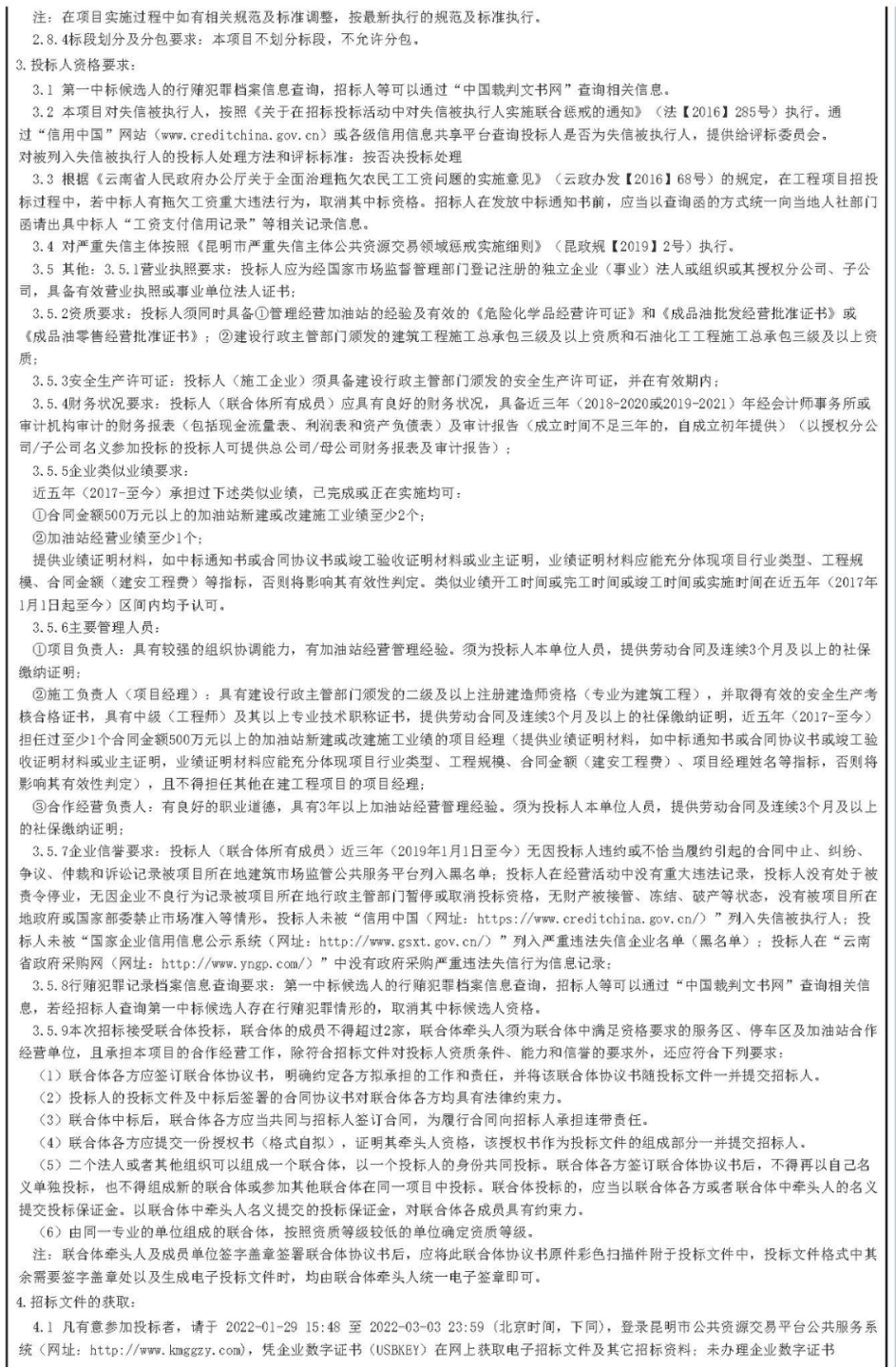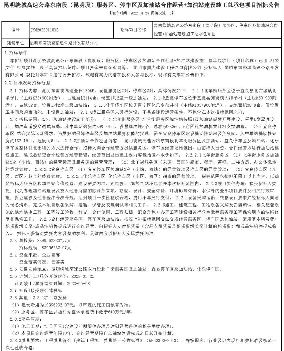 昆明绕城高速公路东南段(昆明段)服务区、停车区及加油站合作经营+加油站建设施工总承包项目招标公告