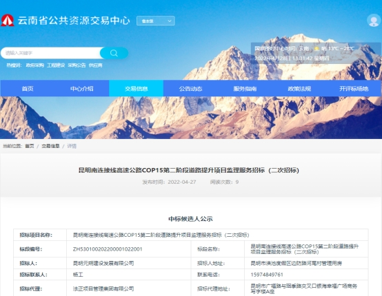 昆明南连接线高速公路COP15第二阶段道路提升项目监理服务招标(二次)评标结果公示